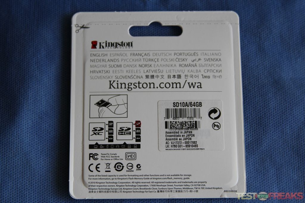The Kingston SDXC 64 GB arrives in typical Kingston packaging with the Kingston logo found on the left side of the cardboard package and the card centered in a plastic blister card. On the back we see a compatibility table for SDXC cards.