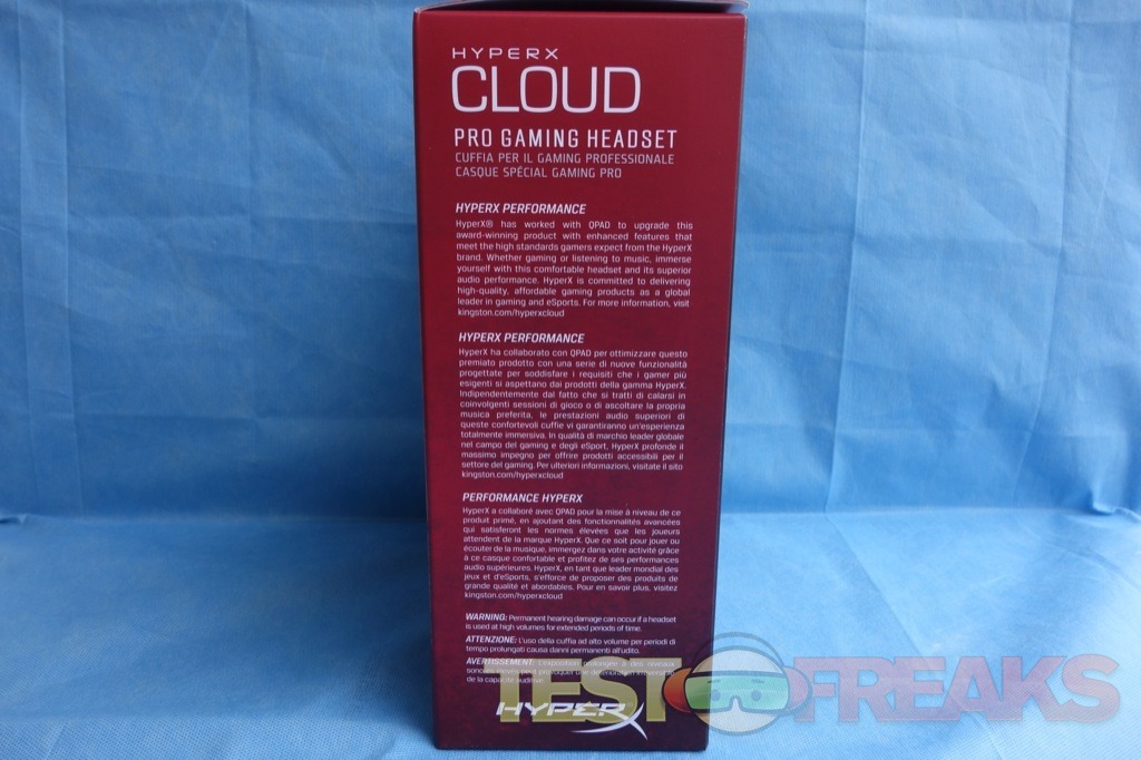 The HyperX Cloud Headset arrives in a cardboard box enveloped by a red colored outer sleeve with the headset pictured on the front. Looking at the back we see an additional headset picture with features highlighted. On the sides of the package is a description of the HyperX Cloud Headset in three languages and additional pictures showing different parts of the headset.