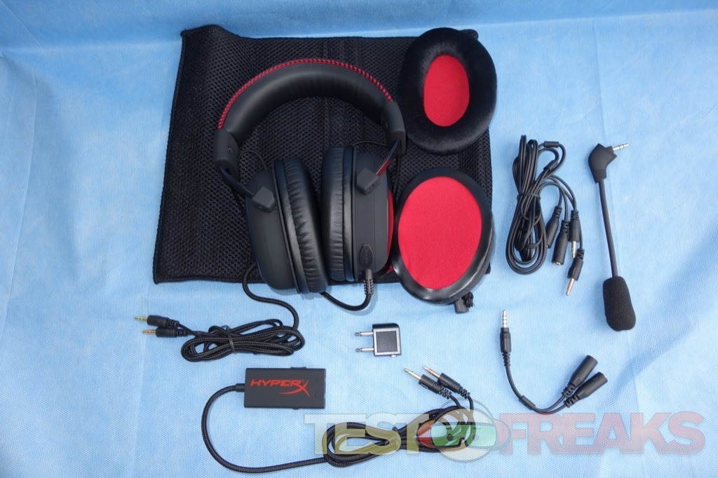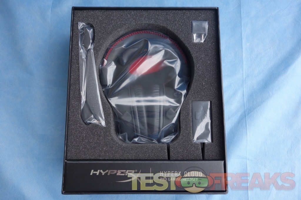 Removing the outer sleeve reveals a black box with the HyperX logo, HyperX Cloud name and website address. Opening this black box we find the HyperX Cloud Headset nestled in a foam enclosure along with three accessories on the side and a box at the bottom with additional components and cables.