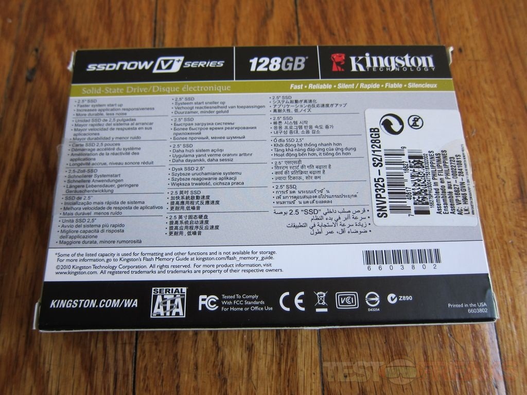 Kingston ships the V+ SSD drives as either a standalone drive or an upgrade bundle; for our review we received the standalone 128 GB model. The drive comes packaged in a cardboard box with the Kingston head logo and the drive capacity on the front and a list of specifications around back in several different languages.