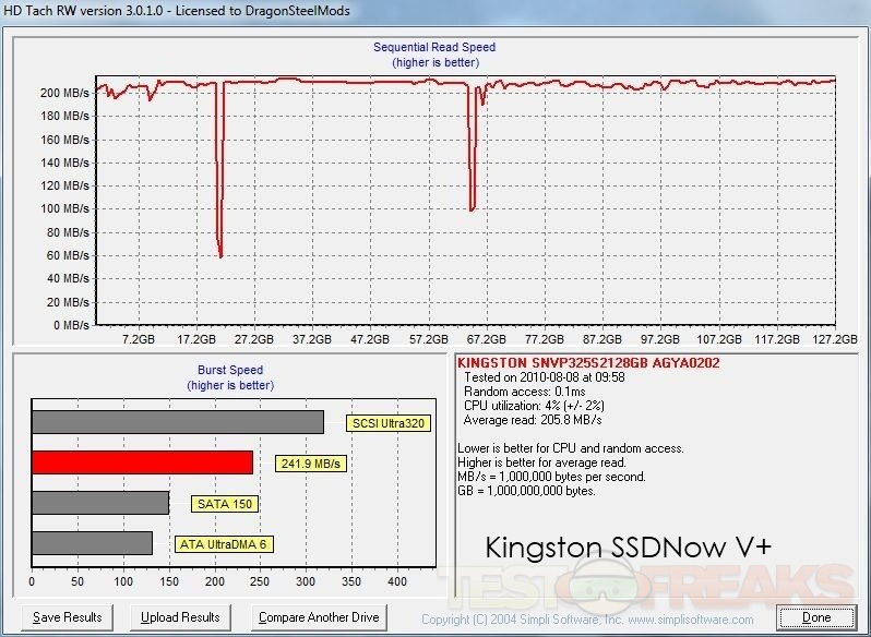 One of the knocks about Kingston SSDs has been the lack of Windows 7 TRIM support; thankfully Kingston has put this issue to rest as the SSD saving technology is now built into their V+ Series Drives. The advertised speeds of 230MB/s read and 180MB/s write speeds are fairly accurate as we hit close to those numbers on a couple benchmarks.