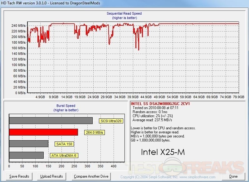 For comparison an 80 GB Intel X25-M SSD with Read Speeds of 250MB/s and Write Speeds of 70MB/s was used. Benchmarking was performed with SANDRA 2010, HDTachRW, ATTO Disk Benchmark and CrystalDiskMark.