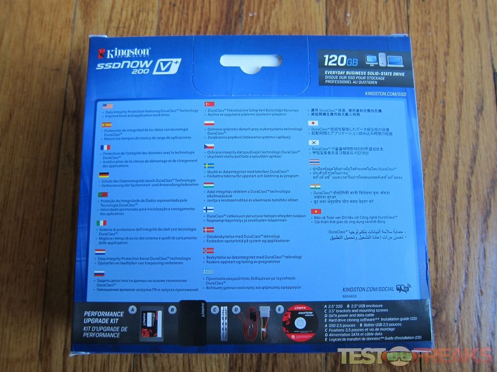 The Kingston SSDNow V+200 Drive performance upgrade kit comes packaged in a blue cardboard recyclable package with an image of the drive on the front along with the Sandforce logo on the bottom left, the drive capacity is found on the bottom right. Kingston offers a three-year warranty on these drives which is advertised on the front and sides of the box. On the back we see a description of features in several different languages along with a listing of the package contents.