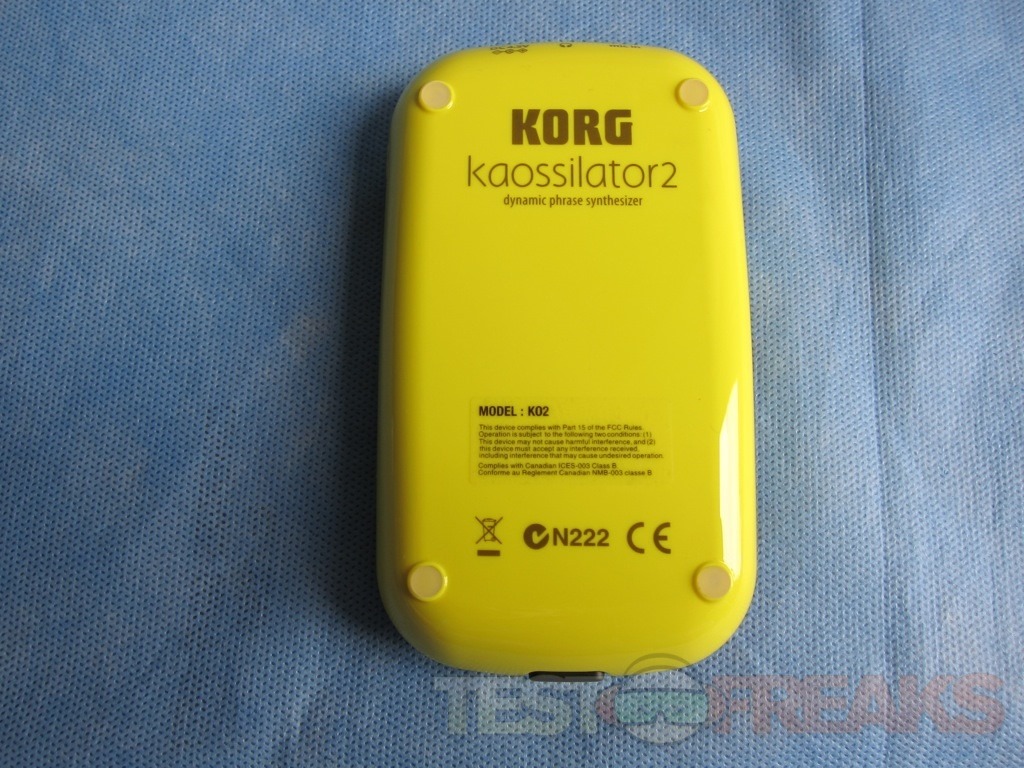 The Kaossilator 2 is composed of black and yellow plastic making it look like a musical bubblebee. It measures 7.6 cm x 12.8 cm x 2.5 cm, is slightly larger than a deck of cards and weighs 105 g without batteries. Two AA batteries provide approximately 5 hours of power. An optional AC adapter is also available from Korg.