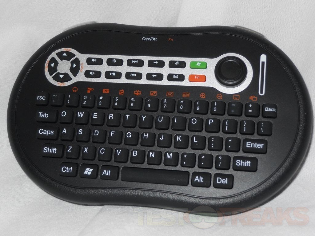 So here’s the keyboard itself, it’s small and it reminds me of a gamepad actually. At the top on the right is a joystick that controls the mouse, to the right of that is a touch sensitive slider for scrolling.