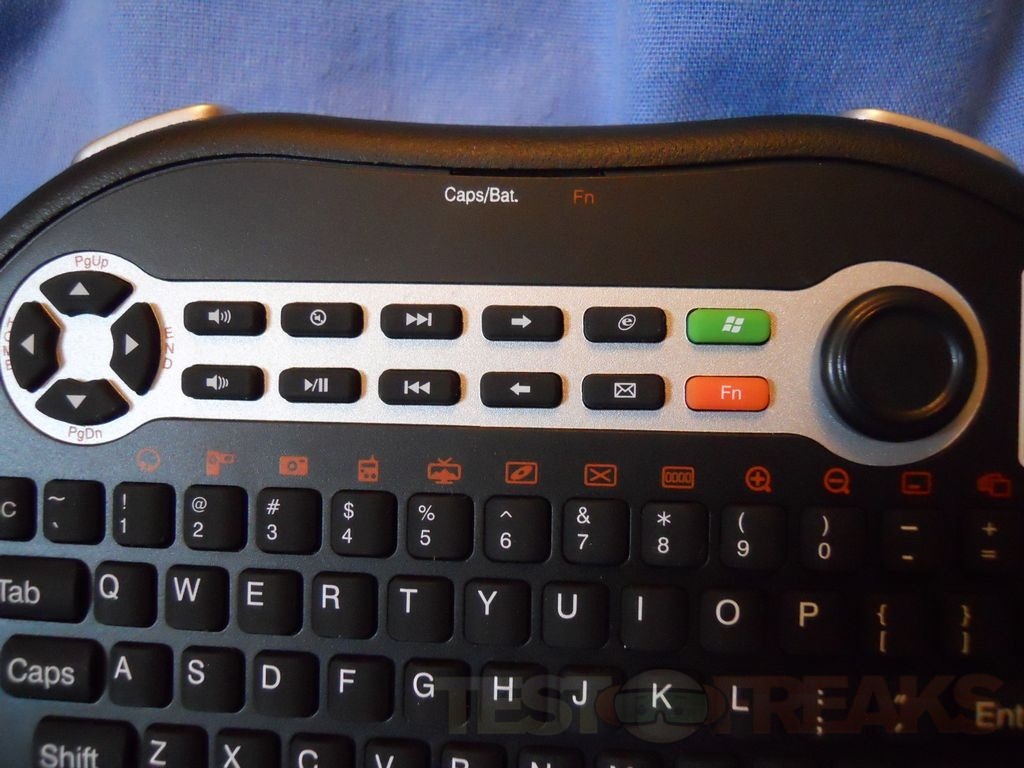 Here’s a close up of the top section. On the top is the directional buttons, multimedia buttons, MCE and Function button. On the keyboard you’ll see orange icons that are to be used with the Function button like magnify, close window, My Videos, My Pictures, My Music and more. The joystick is spring loaded, when you move it the stick springs back to the center position. At the very top of the board are two LEDs for Caps Lock and for the Function button to indicate them being in use or on.