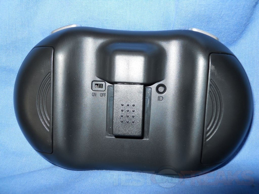 The back of the keyboard has handholds that are actually the battery covers, one on each side. The USB wireless receiver fits into a spot on the back as well. There is also a power switch and a reset button there as well.