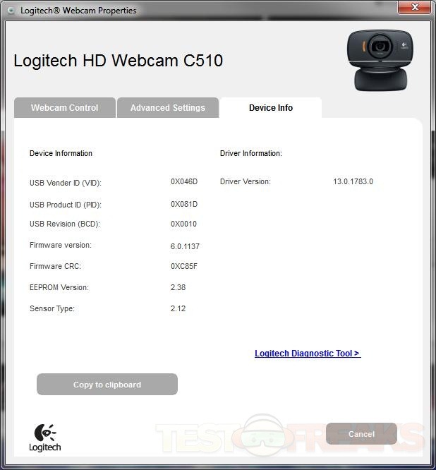 Under the Settings you’ll find three pages for Webcam Control, Advanced Settings and Device Info.