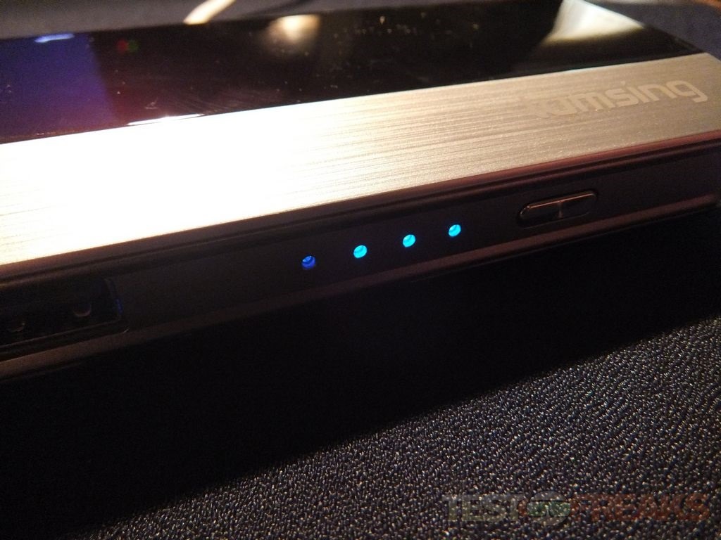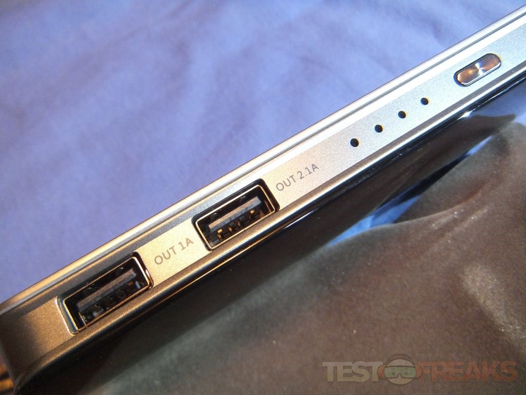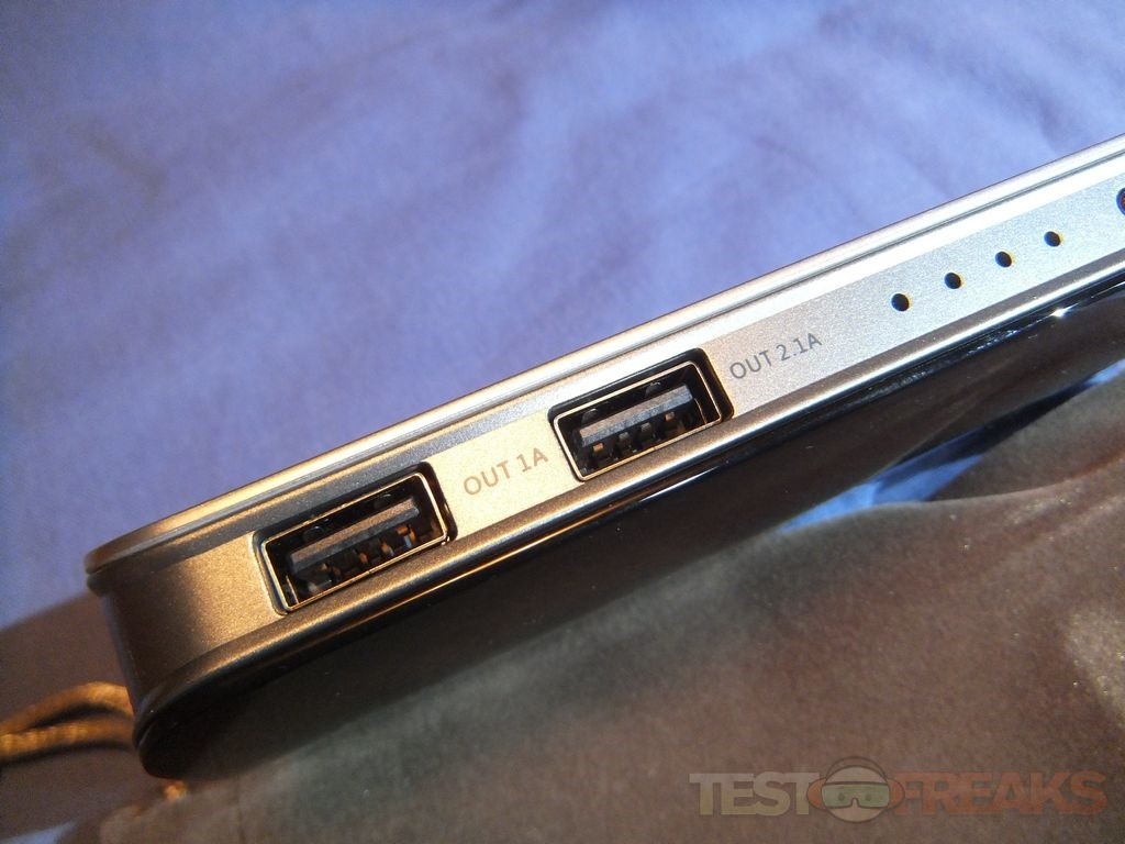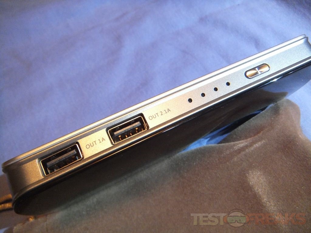 On the Front edge is where you’ll find the two USB charging ports that are labeled Out 1A and Out 2.1a. There’s four LED indicators that will light up blue, they indicate battery charge or capacity levels and are 25% each. There’s also a silver oval shaped button to power the battery on to begin charging.