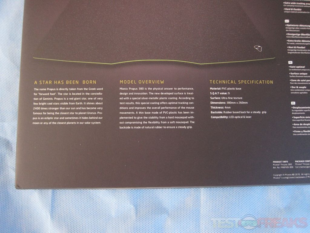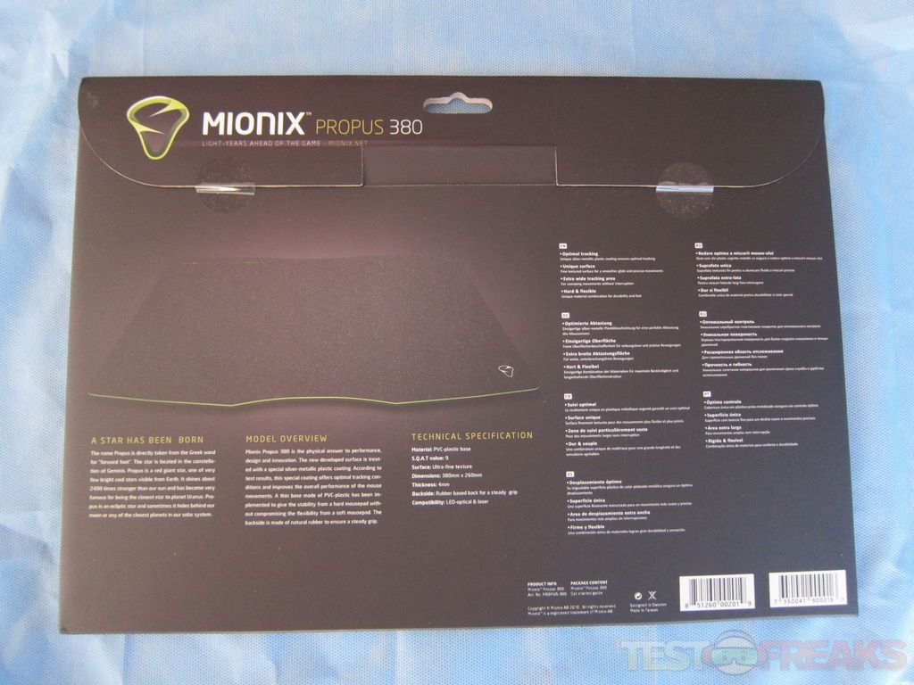 The Propus 380 arrives in an envelope style cardboard package with an image of the mousepad on the front. The back of the packaging lists features and product overview with another glamour shot of the Propus 380.