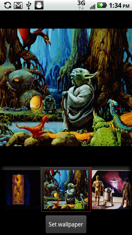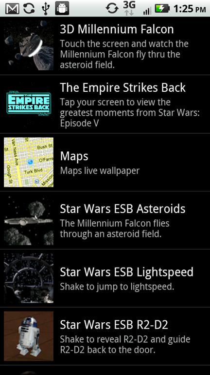 As I mentioned several live and still wallpapers are included. The live wallpapers are unique surely. In one you can control R2D2 and make him move around your home screen.