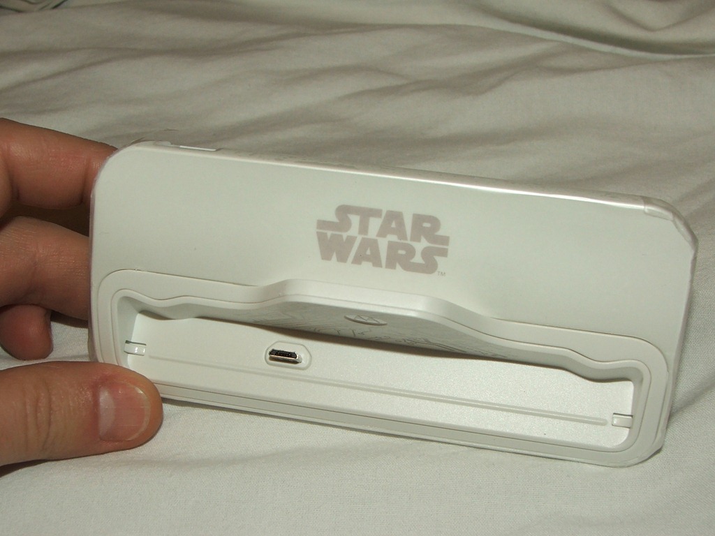 The dock is white and it has the Droid R2D2 logo and Star Wars logo on it.