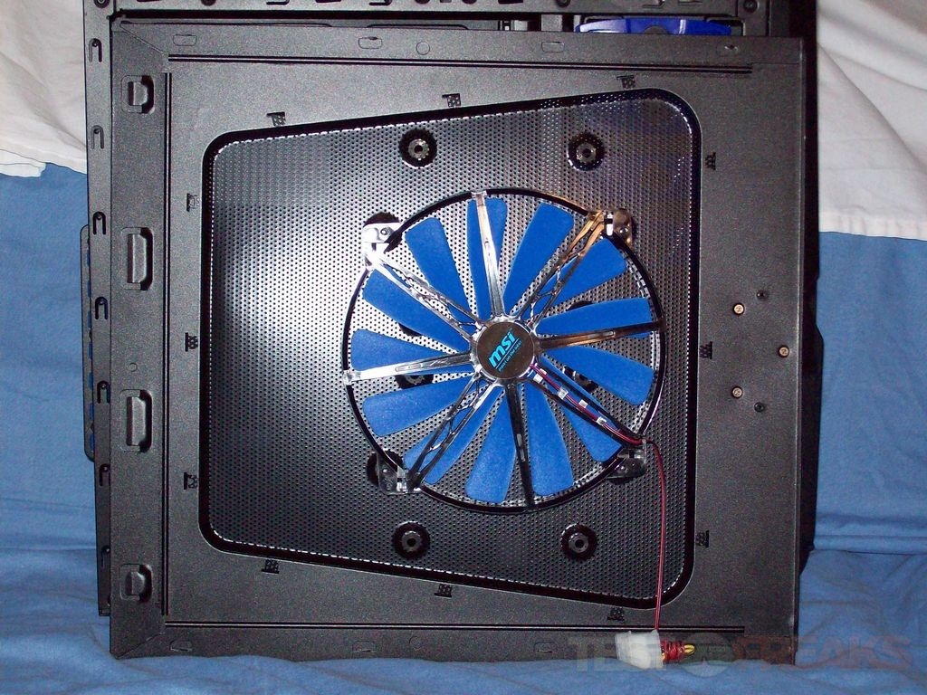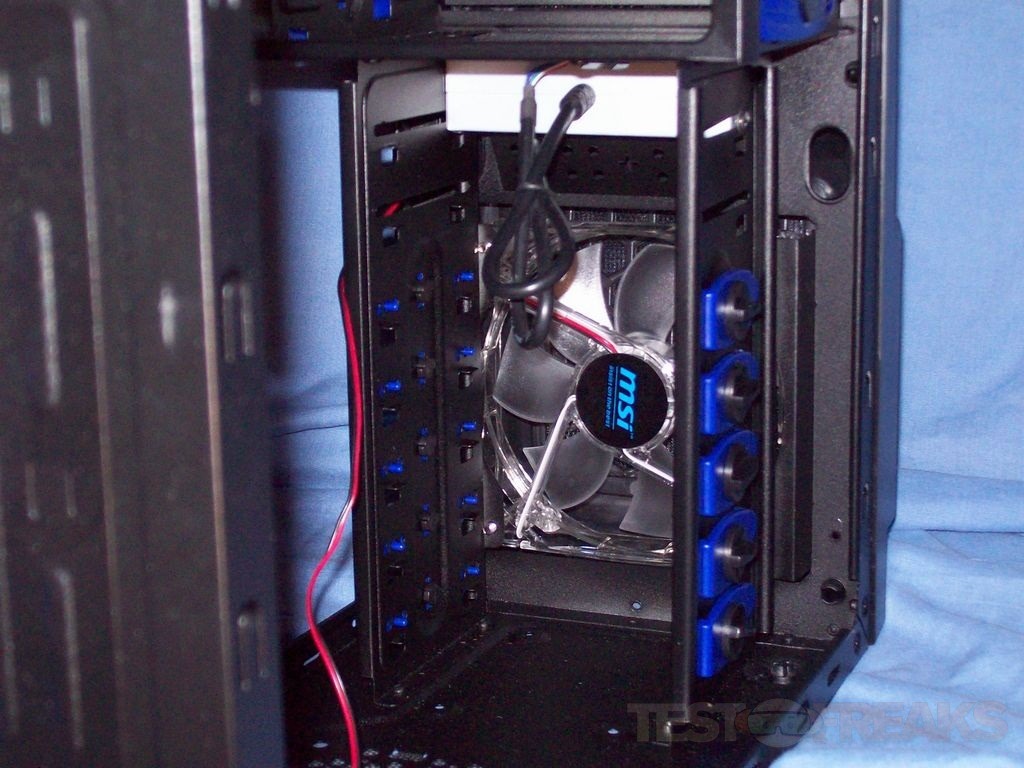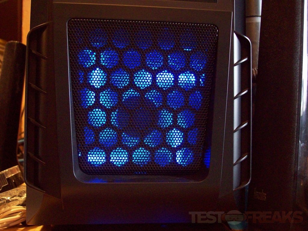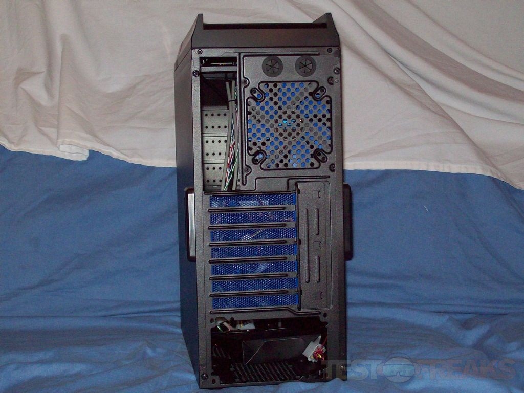 Here’s the left side panel off so you can see the fan from the back side, yes it’s blue. I’m not too sure about the whole black and blue color scheme, but I’ve seen worse.