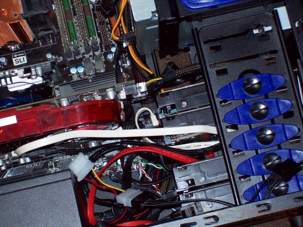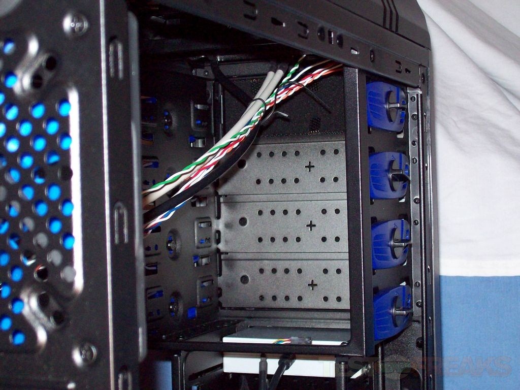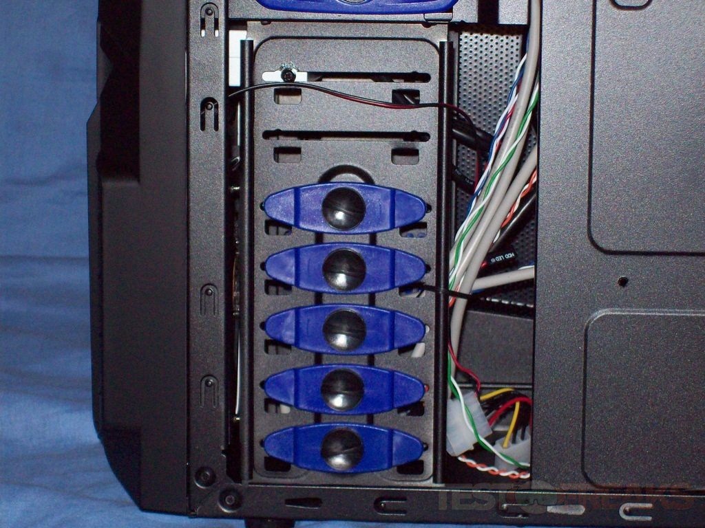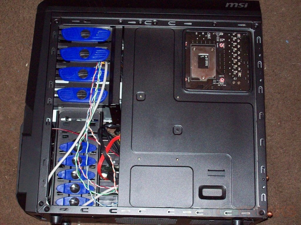 Here’s the left side panel off so you can see the fan from the back side, yes it’s blue. I’m not too sure about the whole black and blue color scheme, but I’ve seen worse.