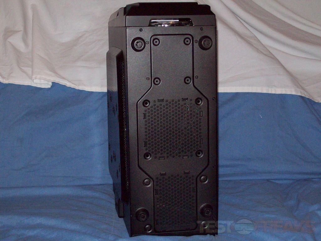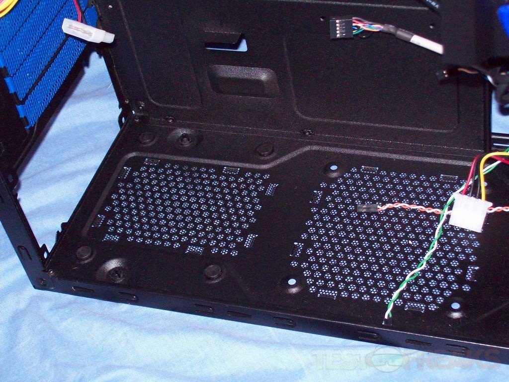 On the bottom of the case you’ll notice tall feet and venting for another 120mm fan and for the power supply.
