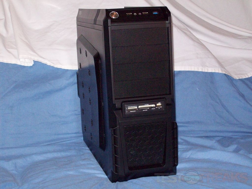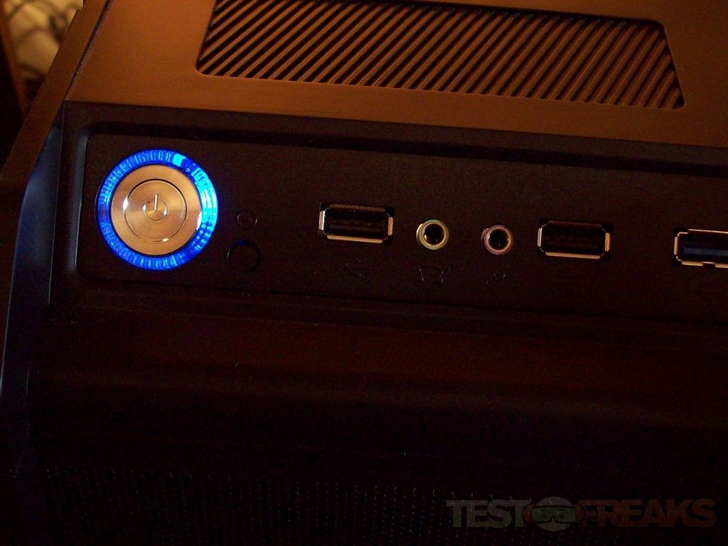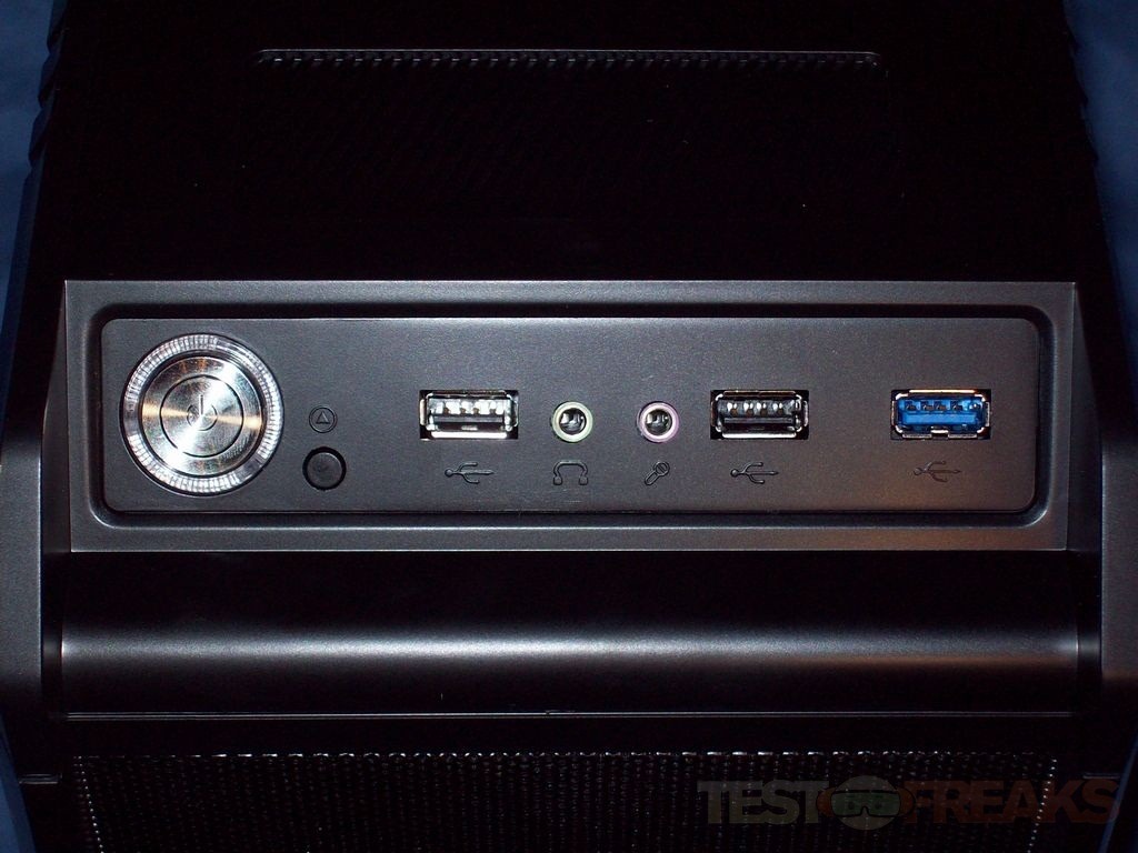 On the top of case is space for four 5.25” devices and above that you’ll find the front control panel which has power and reset buttons along with audio ports, USB 2.0 and a USB 3.0 connection.