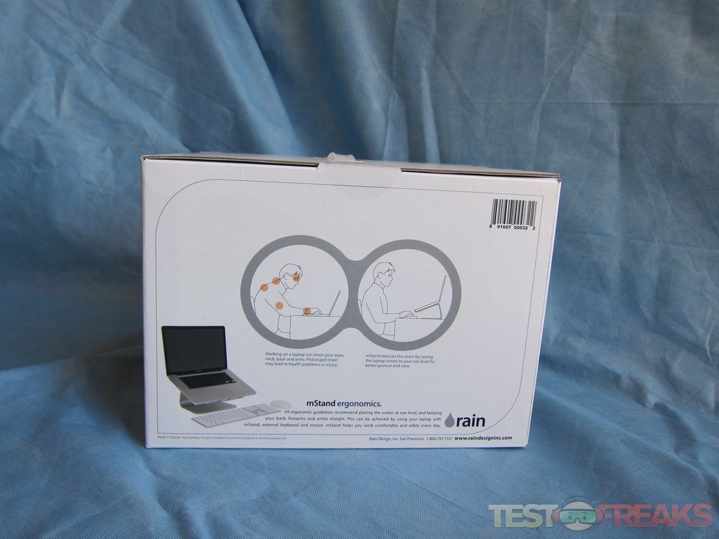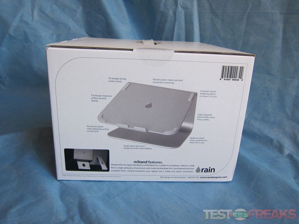 The mStand arrives in a white cardboard box with pictures of the device on the front and back. On the sides we find a listing of features and the ergonomic benefits of the stand. Inside the package we find the mStand nestled between two cardboard holders, along with the catalog of products from Rain Design.