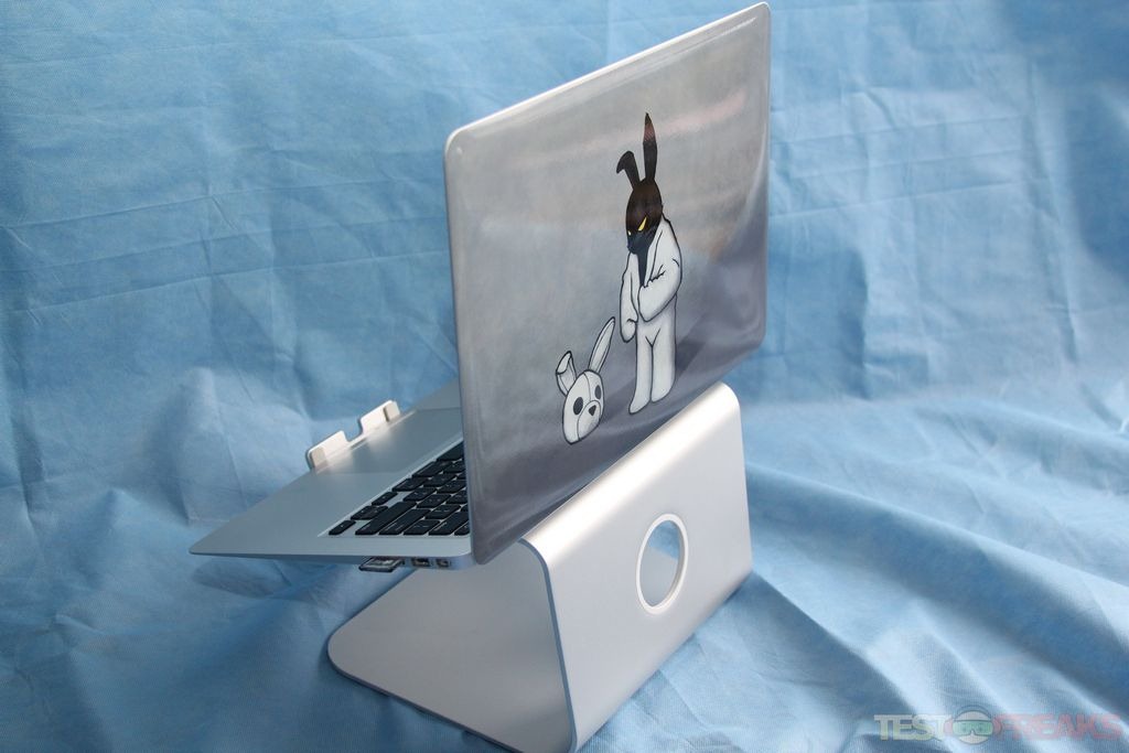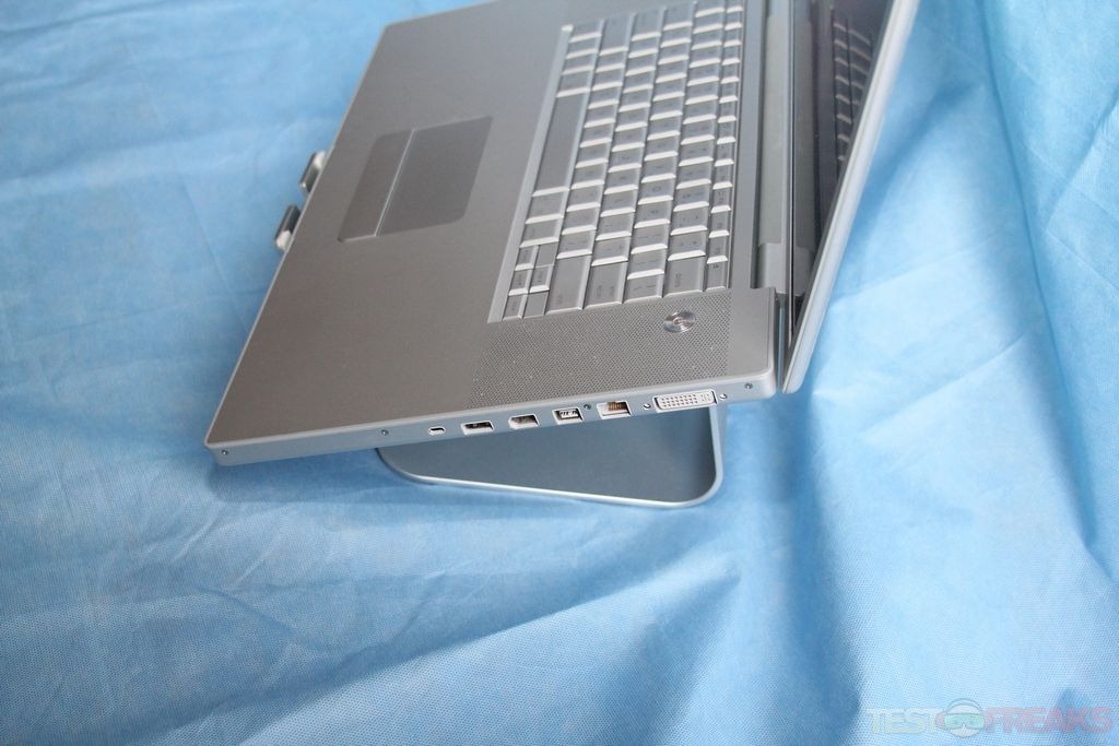 In addition since it’s composed of aluminum it functions as a heat sink to keep the laptop cool. Rain Design also left an opening at the back for wire routing.