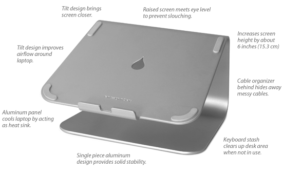 Rain Design created the stand to raise the laptop’s screen 5.9 inches higher allowing it to meet the user’s eye level, which in turn creates a more ergonomic work position. It can accommodate all Apple laptops or other laptops with depths of less than 10.5 inches.