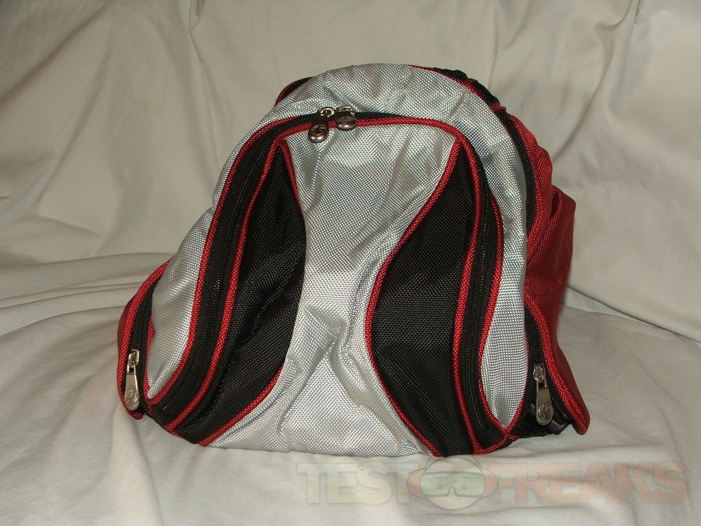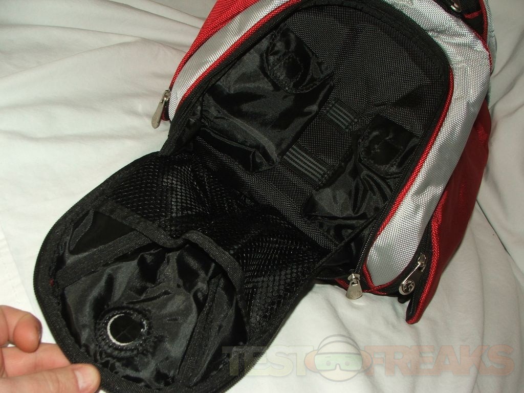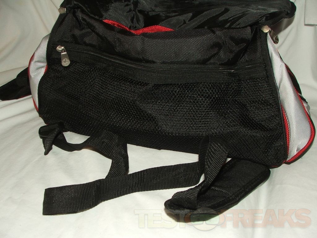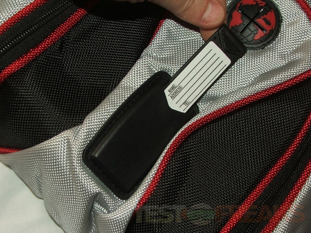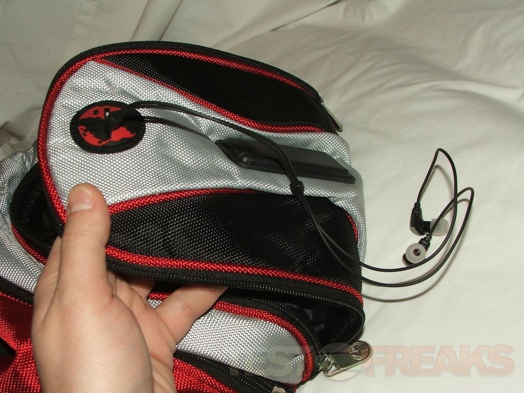 On the sides of the bag are two more pockets, one has a rubberized opening on it to pass through earphones and a sliding luggage tag.