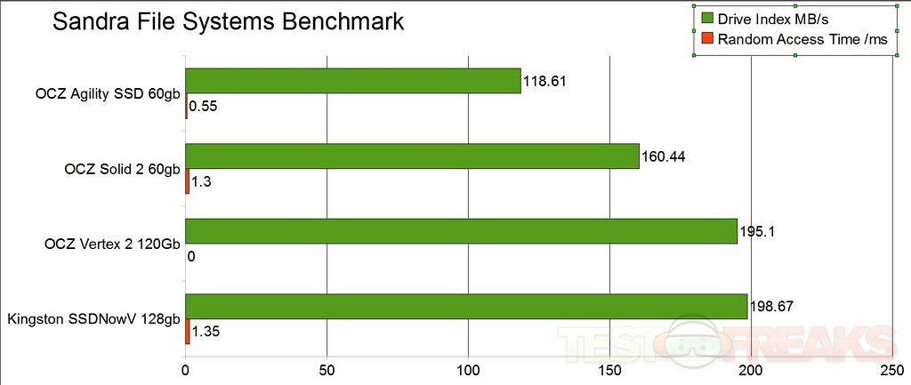 We see the Vertex 2 comes very close to the Kingston in this test for the Drive Index, but the Random Access time for the Vertex 2 actually gave me Zero…