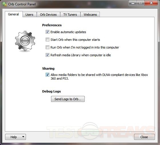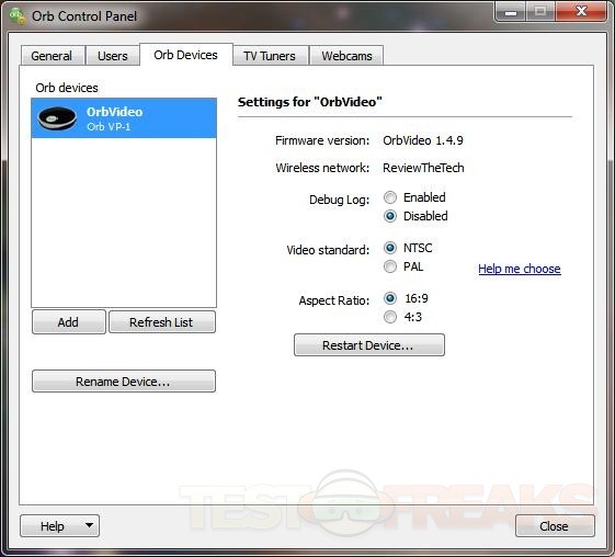 The Orb Caster software is what let’s you stream your media to the Orb TV. In the settings you can configure the Orb TV and the Orb Caster software. The second tab is Users, here you can configure where your media is and you can password protect it as well and enable orb Remote access if you have it. The next tab is Orb Devices, here you’ll find the Orb TV if it’s connected and then you can configure a few small things like Video Standards and Aspect Ratio. The next two tabs are for TV Tuners and Webcams if you have them installed.
