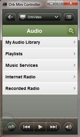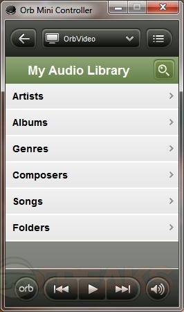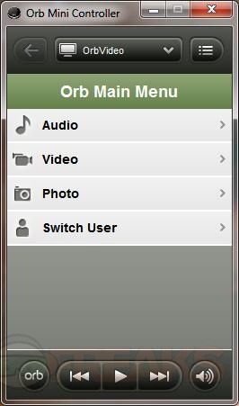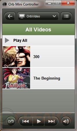 The Orb Mini Controller will allow you to control your media just like a regular media player. When you first turn it on you’re greeted with categories for Audio, Video, Photo and an option for Switch User. Selecting one of these will open up more selections depending on which choice you made. You can select music by Artists, Albums, Genres, Composers, Songs or Folders. If you go to your video library you’ll se what you have there to play of course, I have 300 and Witchblade in my iTunes. Through the Orb TV you can watch your own videos, listen to your music and even view your photos quickly and easily right on the big screen.