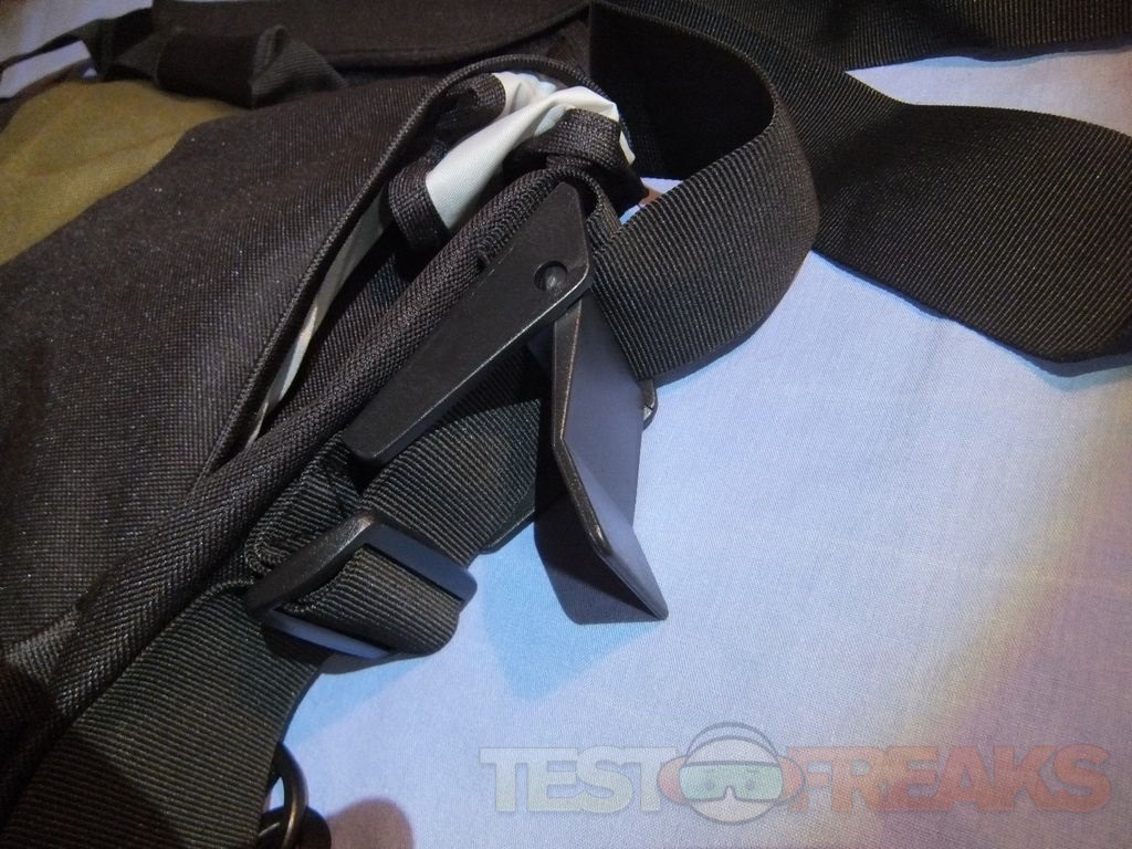 There is a very large buckle on the side so you can quickly and easily adjust the length of the shoulder strap.