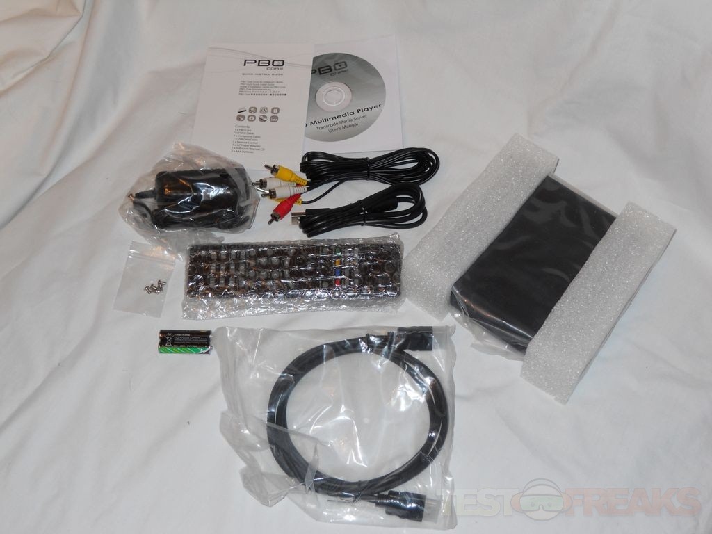 Included in the box with the PBO Core you’ll find user manual on CD, quick start guide, USB cable, A/V Cable, HDMI cable, batteries, screws, power supply and the remote.