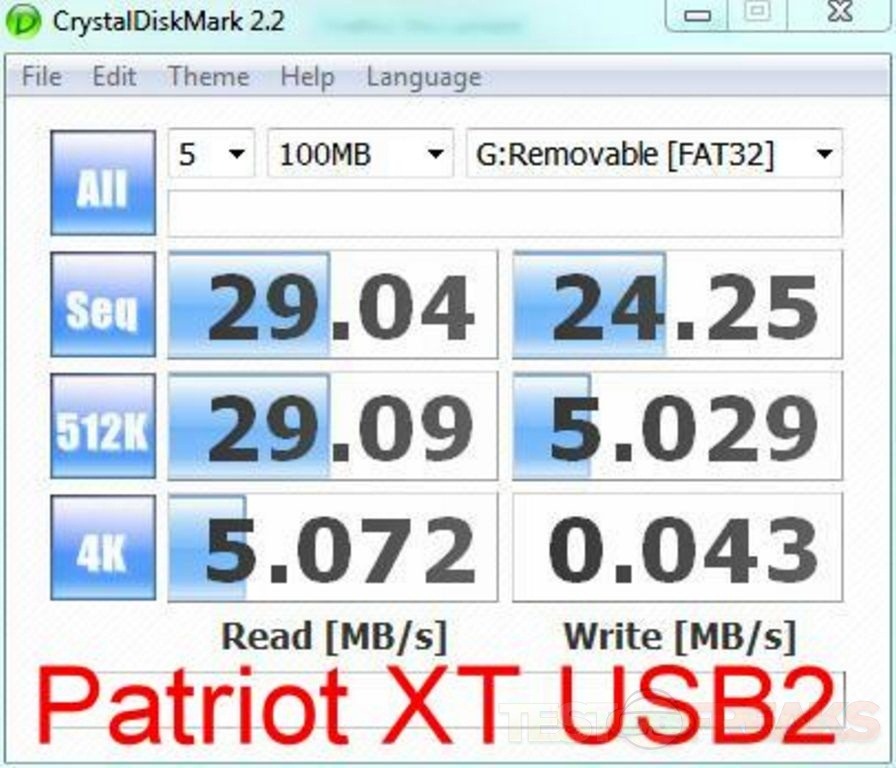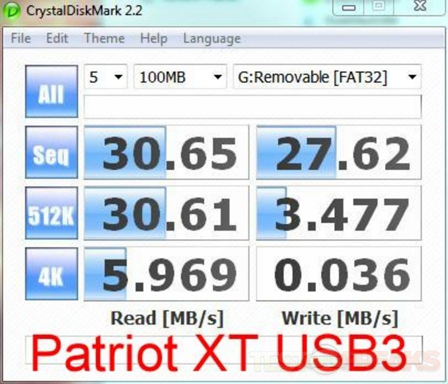 The Patriot Xporter Rage 32GB USB drive isn’t bad overall, it has very good write speeds, and decent read speeds.