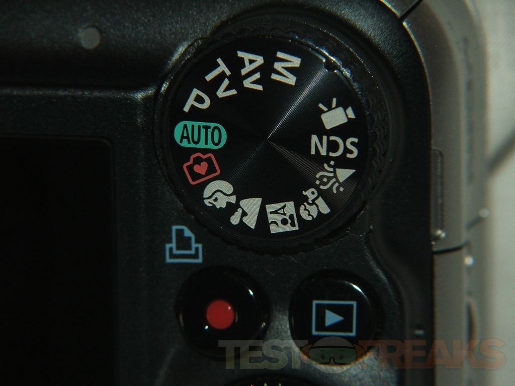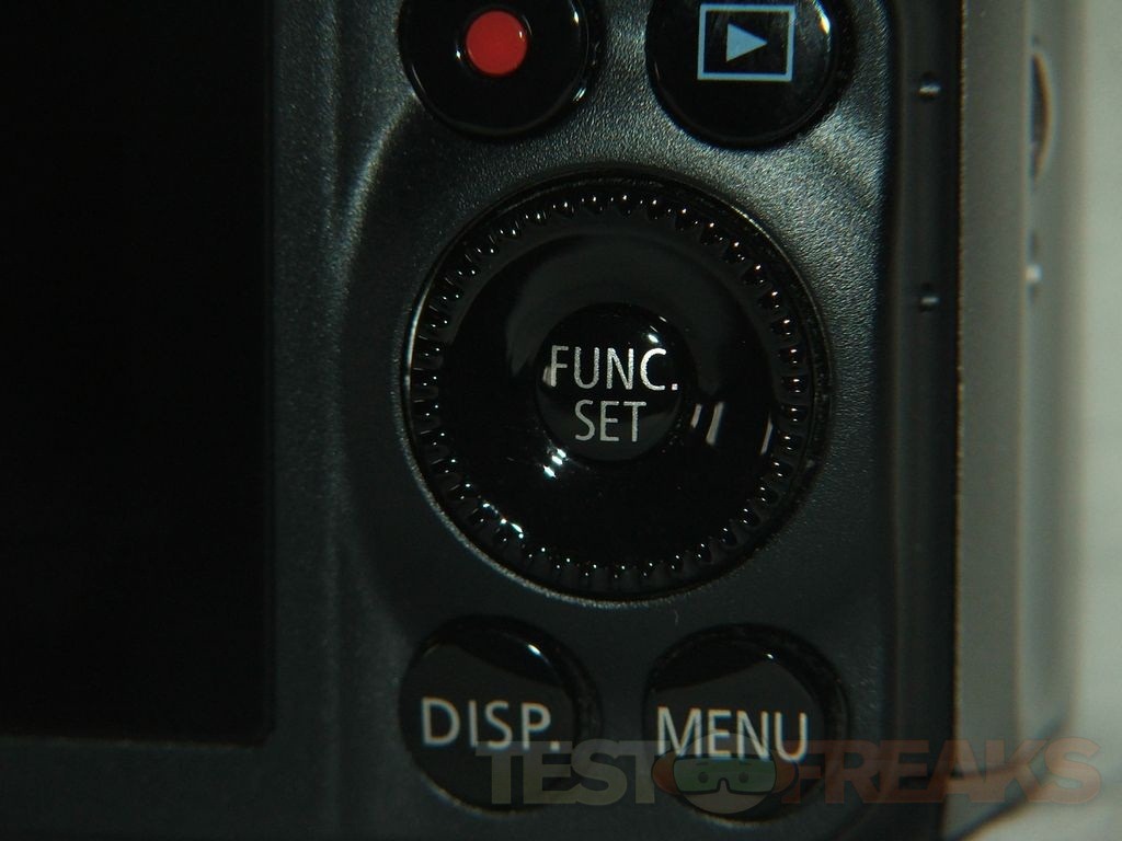 To the right of the LCD is a dial with photo settings, and beneath that is the play and record buttons, then below that you’ll find a navigation pad that actually turns as well like a dial, then below that on the bottom are the menu and display buttons.