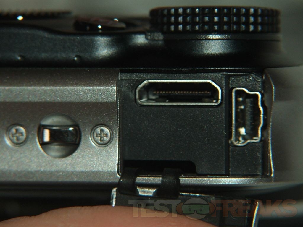 On the right side the hole for the wrist strap and a door, behind which is you’ll find the USB connection, and HDMI. If you recall when we were looking at the contents there was no HDMI cable, but there is an HDMI connection.