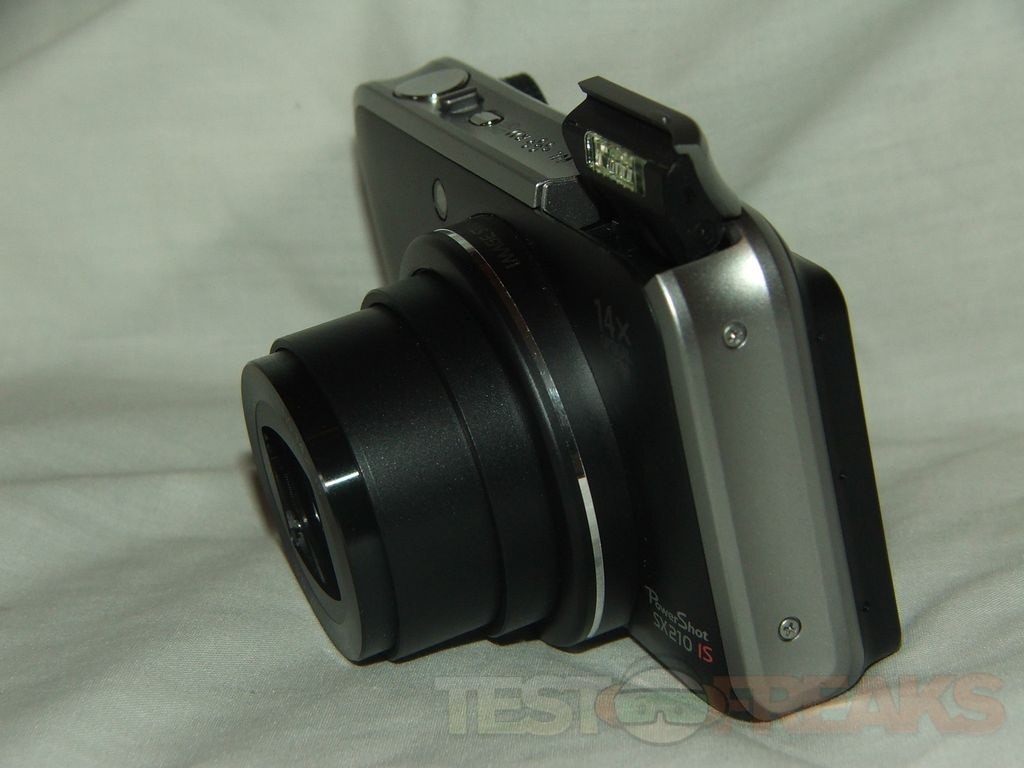 The lens comes out pretty far when powered on, and off to the top right is the flash.