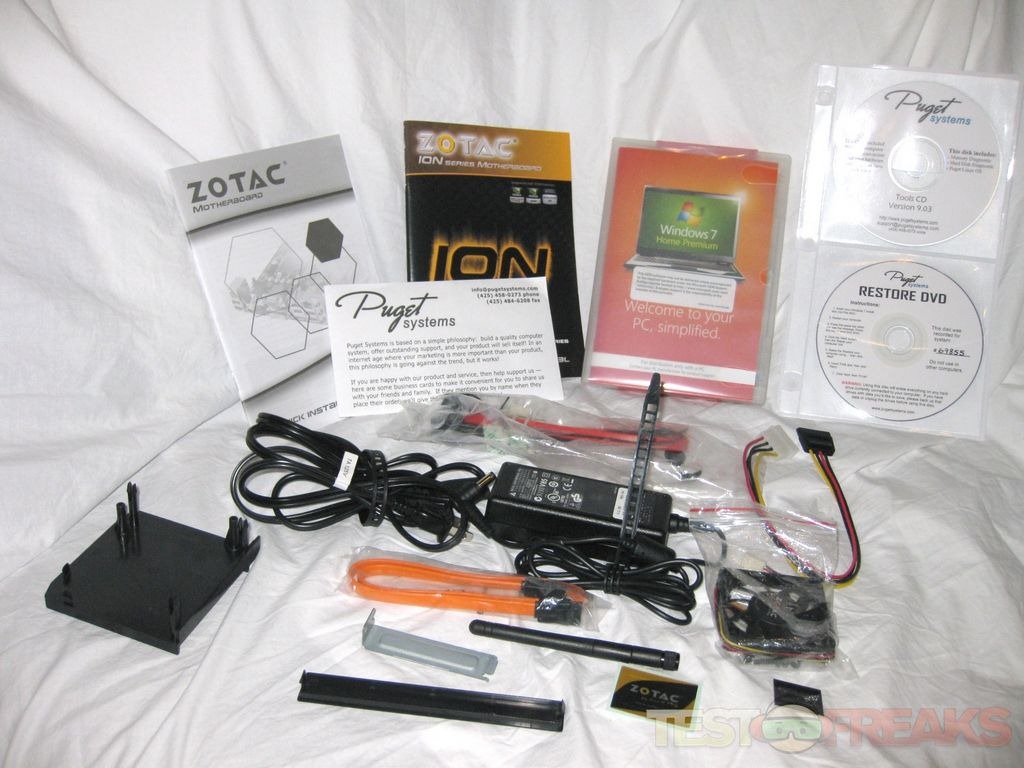 In the parts package we see the Zotac Ion Manual, an OEM Windows 7 Install Disc, power supply, spare SATA cable, spare SATA power connector, Wi-Fi antenna, Heatsink fan, Zotac and Puget name badges, and a few spare case parts. The other parts box contains a Windows Media Center capable remote along with additional parts from the dual TV tuner card.