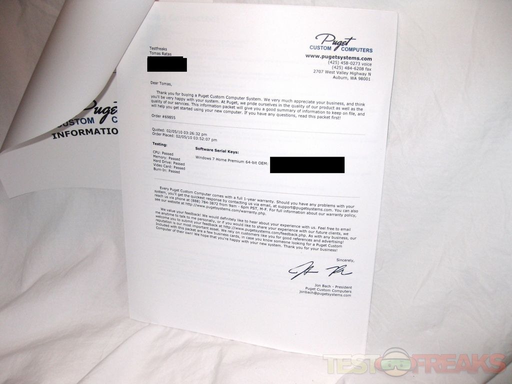 Also included in the package you’ll find an information booklet on your new PC with a cover letter from the president of Puget Systems. This booklet explains the connections found on the rear panel of the PC; as well as providing a quality control sheet which documents the build process from testing the power supply to benchmarking. Puget Systems lists the build components along with warranty and support information. These are some unique personal touches that I have never encountered before with a PC builder before.