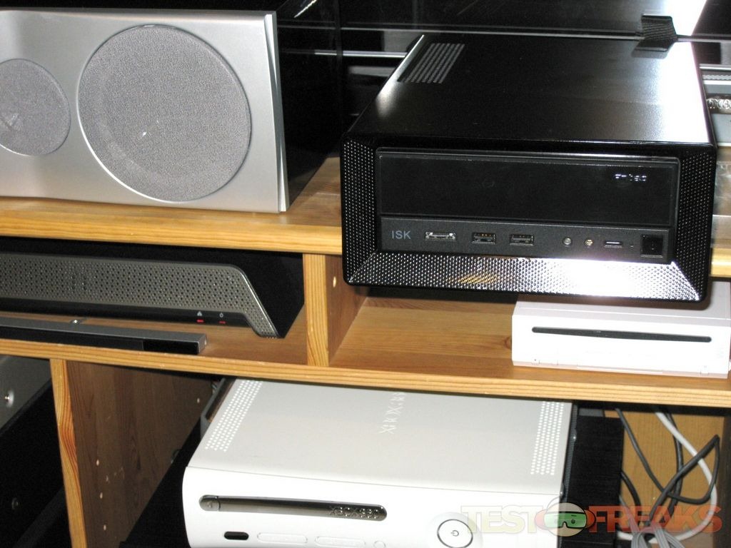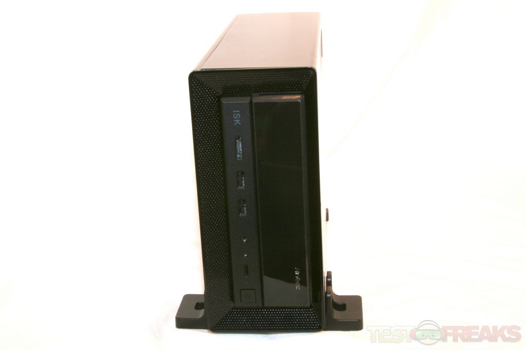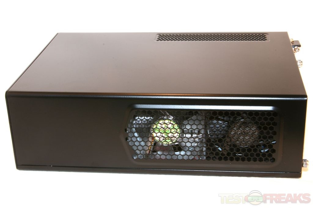The Echo I is a all black small form factor PC designed to work as a HTPC or even a desktop machine. It is housed in an Antec ISK 300-65 case designed to fit Mini-ITX motherboards. This steel case is a jet black with plenty of mesh vents to keep the system cool. One vent is found on the top panel adjacent to the slim expansion card slot and the other on the right panel next to the two 80 mm fans. The case measures 3 ¾” x 8 ¾” x 12 29/32” (9.6 cm x 22.2 cm x 32.8 cm) and should easily fit next to your home theater system or on one’s desktop.