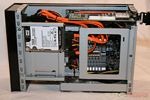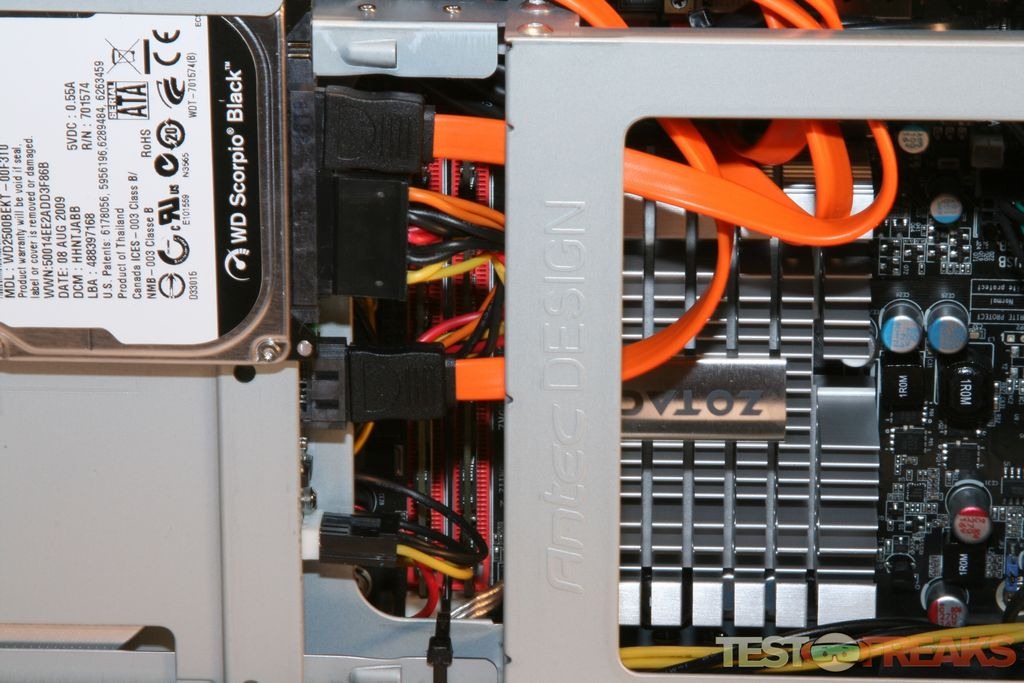 Opening the Echo I reveals a ZOTAC IONITX-F-E Intel Atom 330 (1.6GHz, dual-core) CPU/motherboard with 4GB (2 MB x 2) of Kingston ValueRAM DDR2 800. Puget Systems does a nice wiring job within the limited space of the Antec case. There are three SATA connections on the motherboard with one attached to the Western Digital Scorpio Black 250GB 7200 Notebook Drive and another to the Blu-Ray combo drive. The expansion slot has the Hauppauge WinTV HVR-2250 Dual TV Tuner. Two 80 mm fans blow across the motherboard to keep things cool.