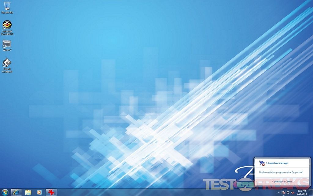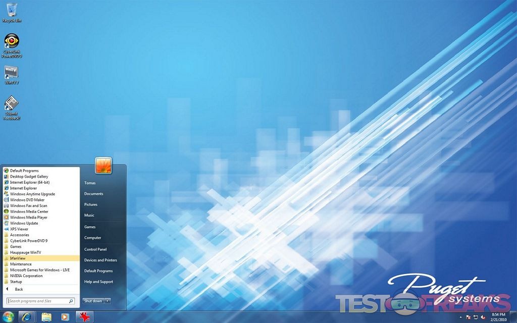 The Desktop has a Puget Systems background and we see icons for WinTV7 program from Hauppauge used with the Dual TV Tuner card and a trial version of Cyberlink PowerDVD9 for Blu-Ray playback. Puget offers PowerDVD9 BD (OEM, cheaper) and PowerDVD9 Ultra as a build options when ordering as well. Be aware that the PowerDVD9Ultra version will set you back about the same price as a new Blu-Ray player itself at around $140.
