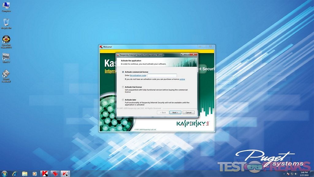 One nice thing about Puget’s rigorous build and testing process is once the machine is started for the first time it is pretty much all set up. I had a user account with my name waiting on the Echo I. Surprisingly there was no antivirus preinstalled but Puget does offer a pre-build option to install AVG Free. With this in mind the first thing I did was put Kaspersky Internet Security 2010 onto the PC.