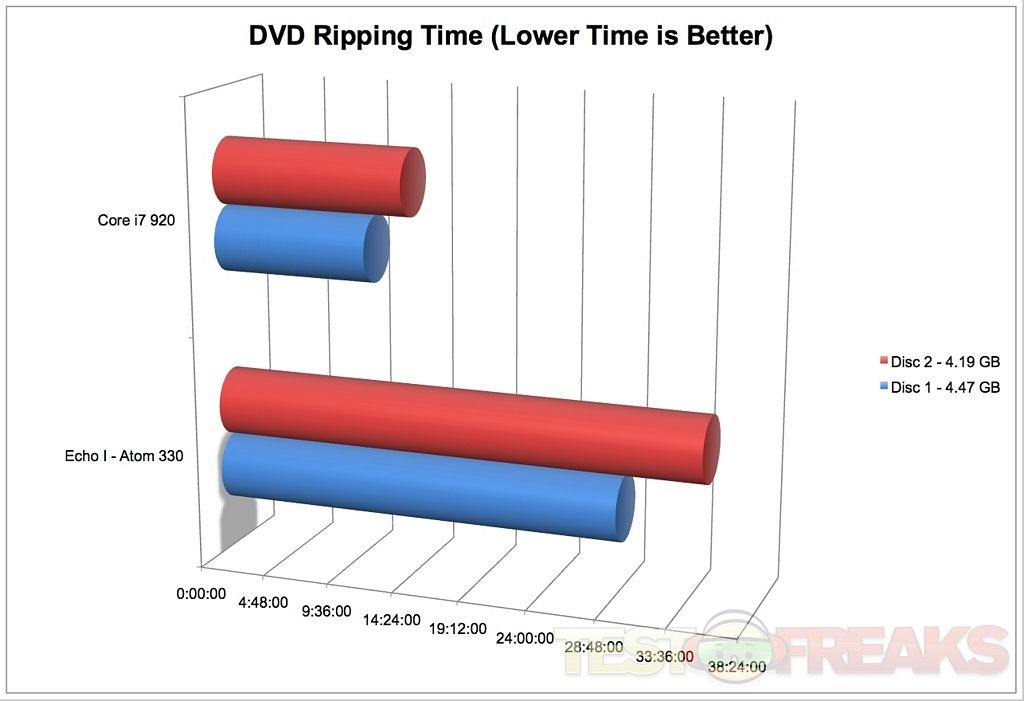 Here we have the DVD Ripping Speed of the Dual Core Atom 330 against a Core i7 920 with 3GB of DDR3 using DVDDecrypterFab 6. I’ll let you guess which CPU was the winner.