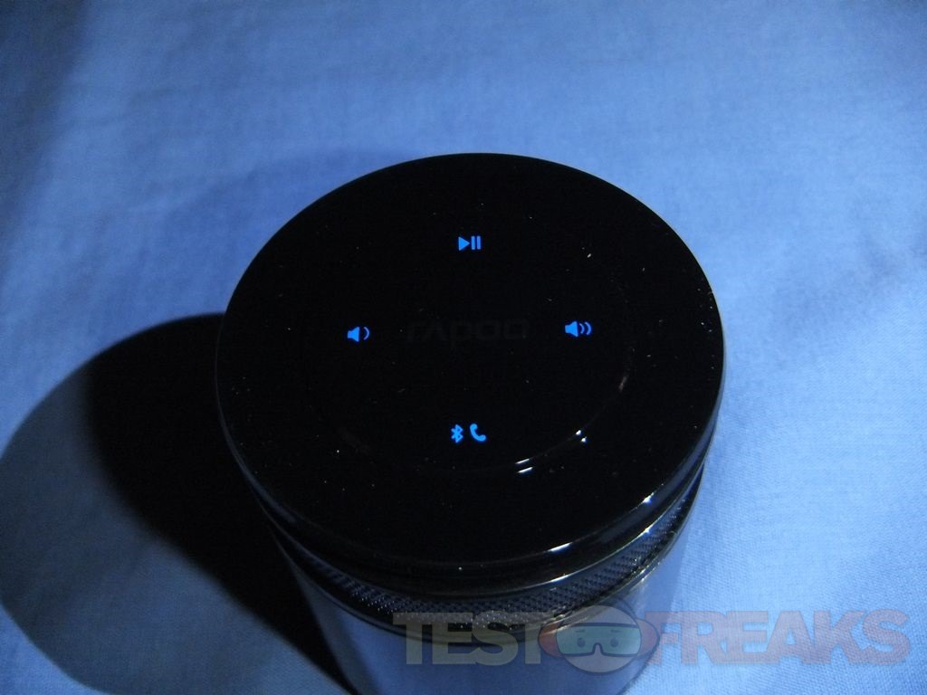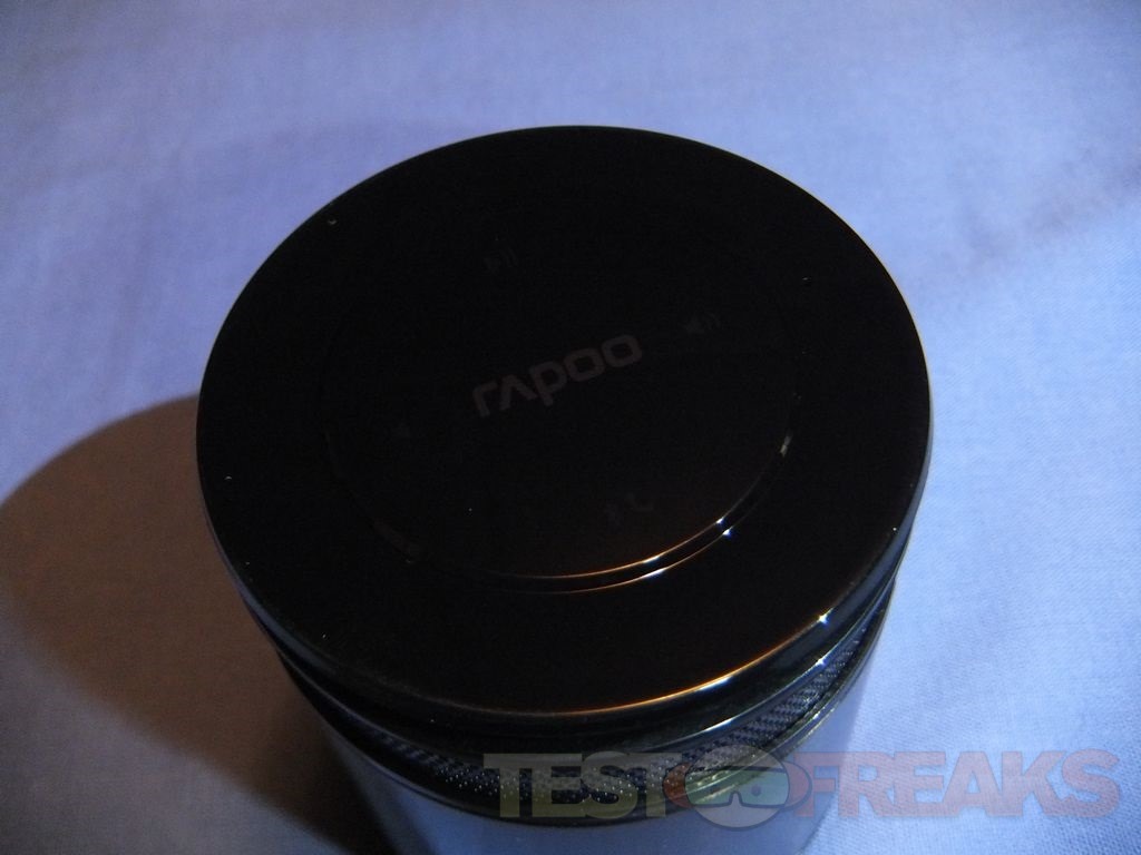 The top of the speaker comes with a protective film on it, the top is actually a touch panel so it needs protecting during shipment. When powered on the controls will light up blue, it’s hard to see, but the Rapoo logo is there in the center. Very hard to see is the tiny hole on the top which is the microphone so you can use the A3060 as a speakerphone.