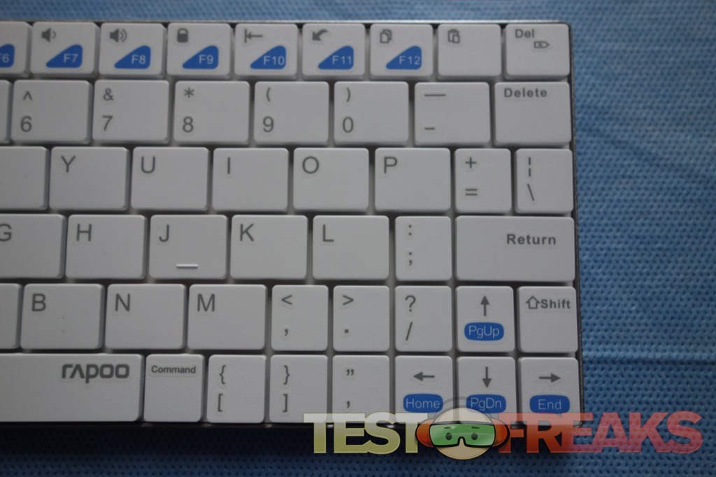 The entire top of the keyboard is composed of 80 plastic keys. The top row doubles as function and multimedia control keys. On the white keyboard the function controlled keys have a blue highlight color. Four additional function keys are found with the directional arrows that have Page Up, Page Down, Home and End options highlighted in blue.