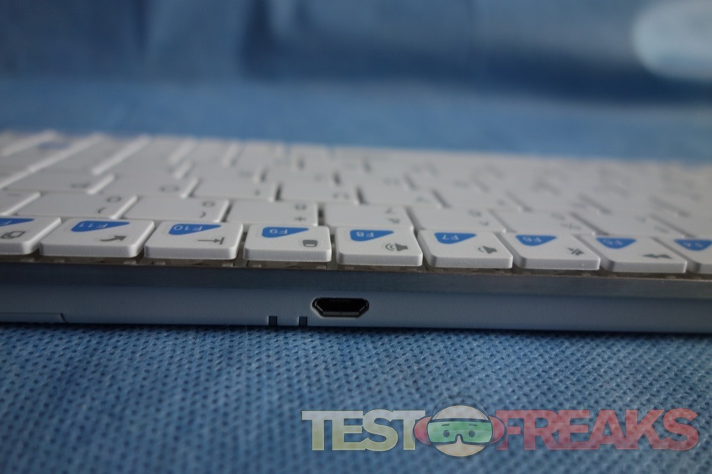 On the bottom of the keyboard we see four rubber feet. A plastic section on the back provides a forward pitch for the keyboard. Her we find the battery along with a power switch, pairing button and a pair of LEDs for power and Bluetooth connectivity. At the back end is a micro USB connector for charging the E6300 BT Ultra-slim Keyboard.