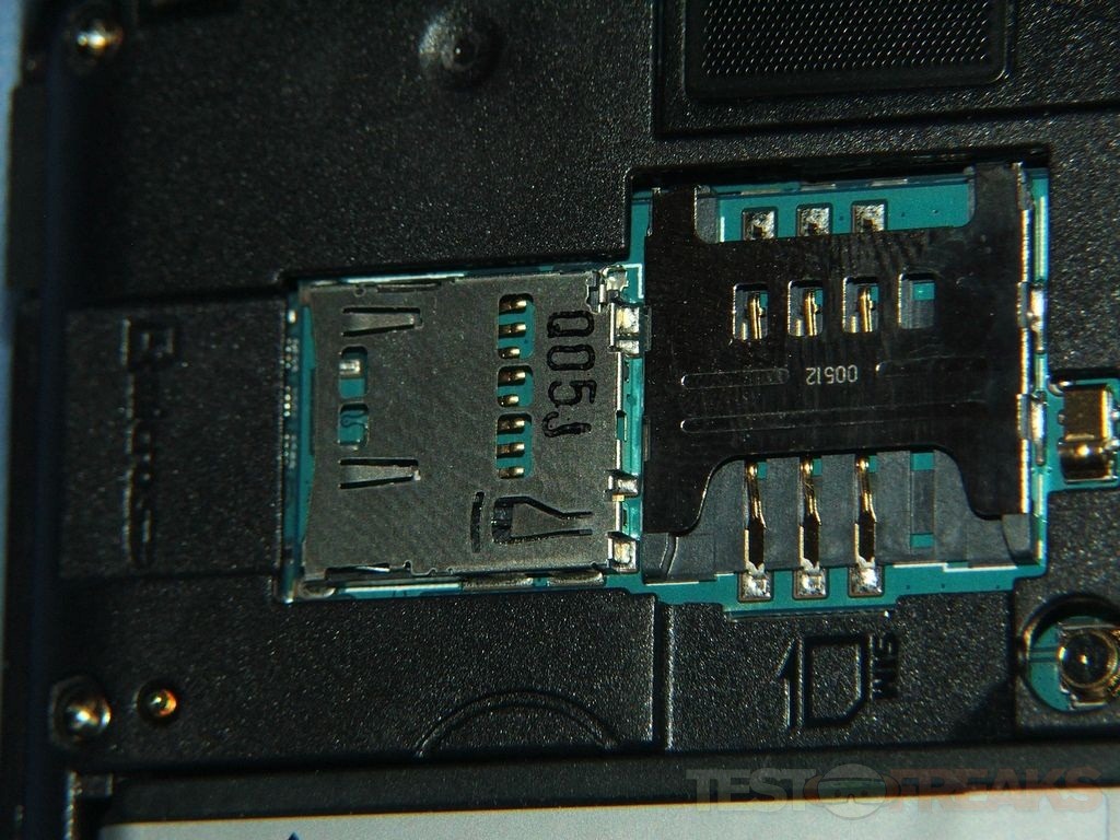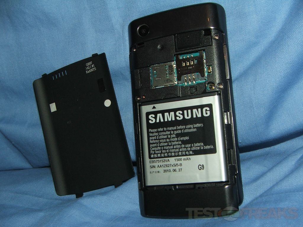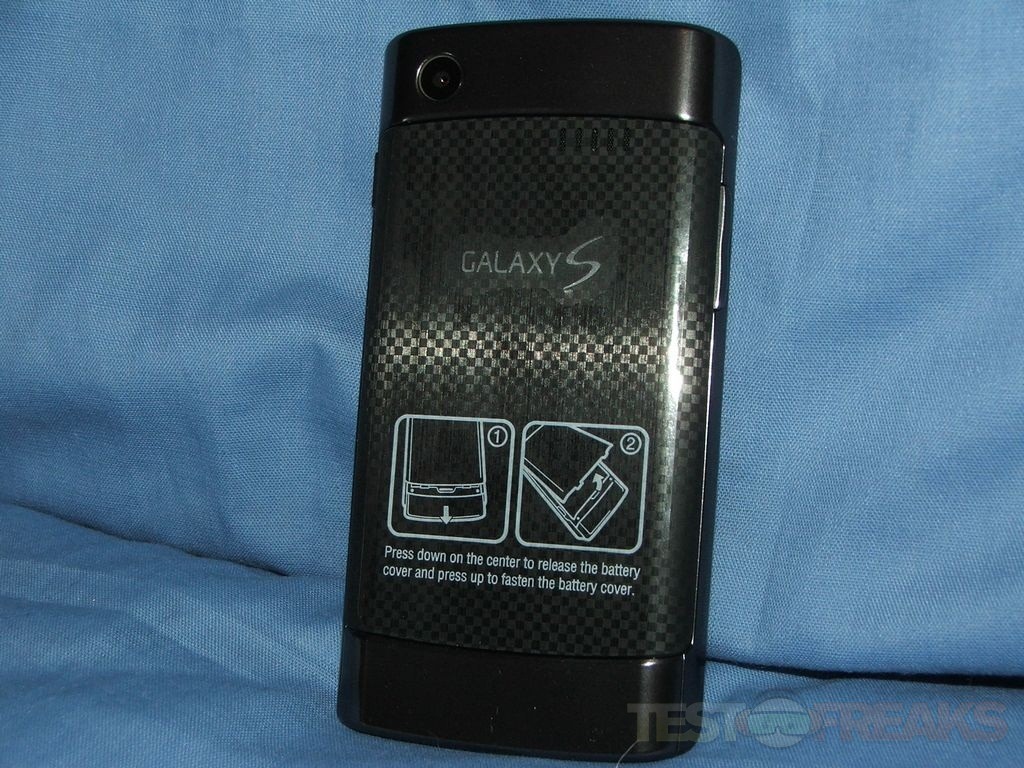 The sim card and microSD card go under the back cover. You’ll need to remove the battery to get at the sim card, but the microSD card can just pop in and out. You’ll notice there’s no microSD card in there, a lot of phones today come with one, but the Captivate has got 16gb built right in so you most likely won’t need a memory card right away.