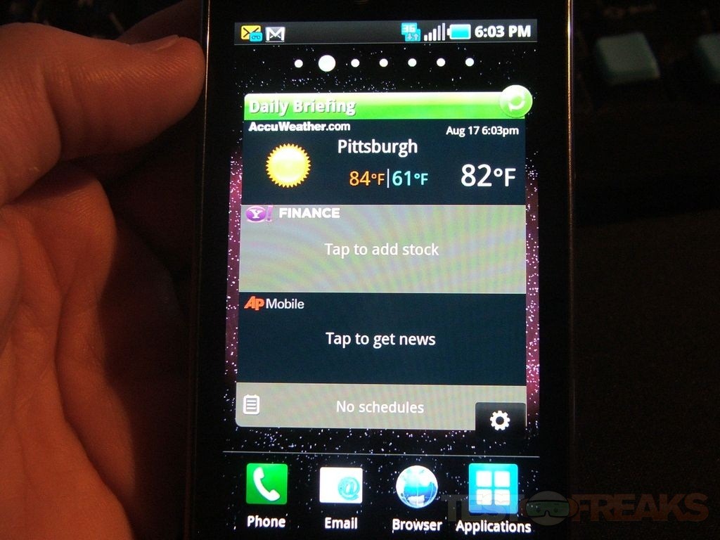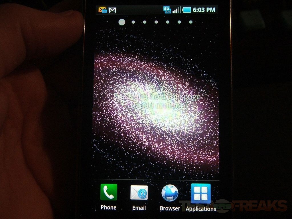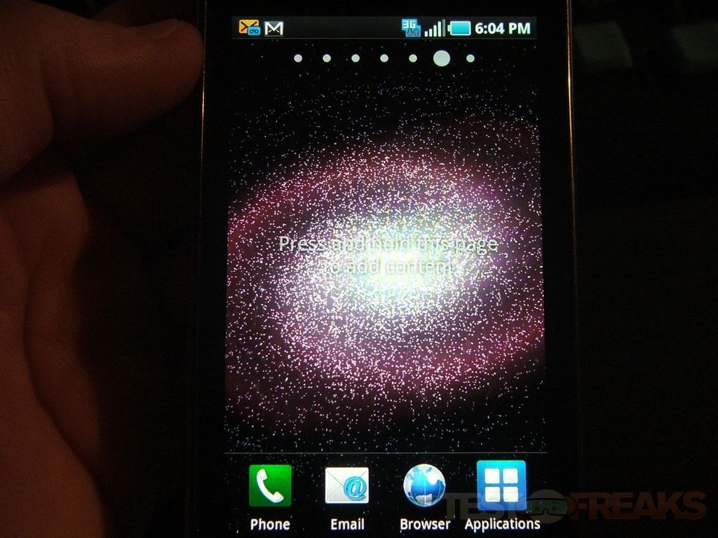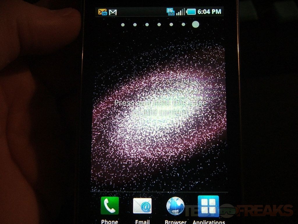 This phone is running Android 2.1, it’s got seven panels, three on each side of the home screen. Some of the panels are setup already but the others are blank allowing you to add whatever you want to them to truly customize the phone to your own liking.