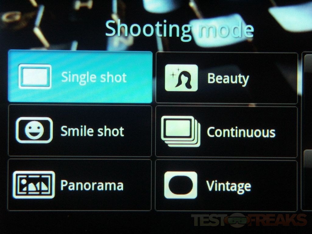 Shot mode: Single / Beauty / Smile Shot / Continuous / Panorama / Vintage / Add me / Action shot / Cartoon