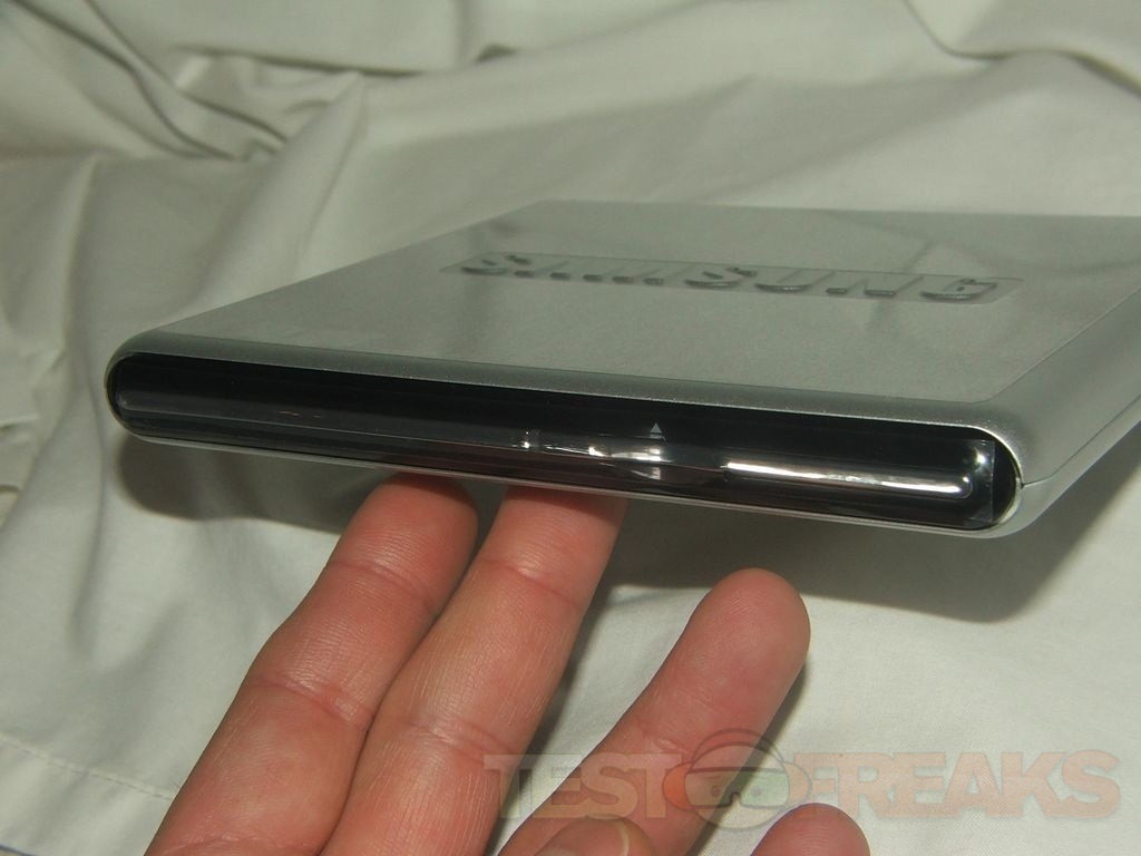 Almost the entire front is the drive tray, all of the black is with just a little sliver border of the housing around it. There’s an LED indicator on the tray and an indentation where you push to eject the disc.