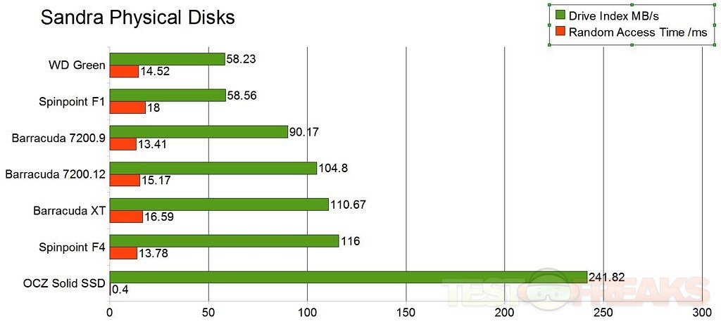 Obviously the OCZ SSD is the fastest with the F4 coming in seconds, actually besting the Barracuda XT on the SATA6 port.