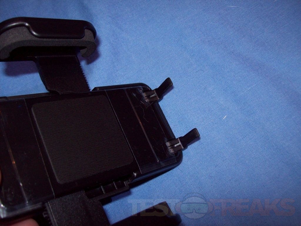 Also on the back is a button to release the spring loaded arms. They pop out and then you puch them back in tot eh size of your phone and they lock into place holding your phone tightly.