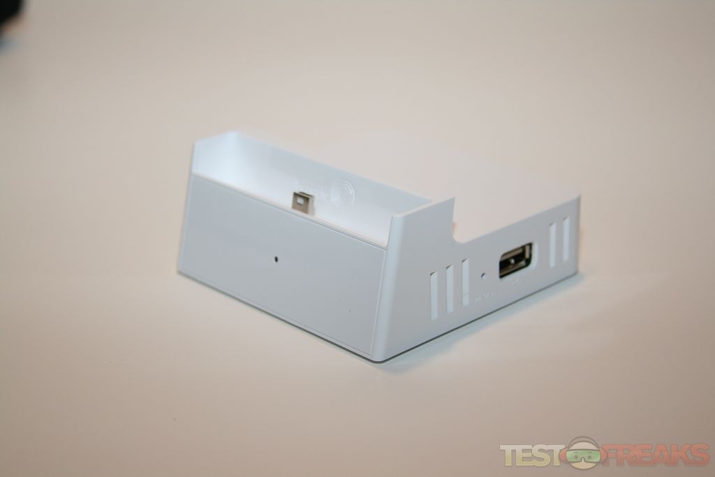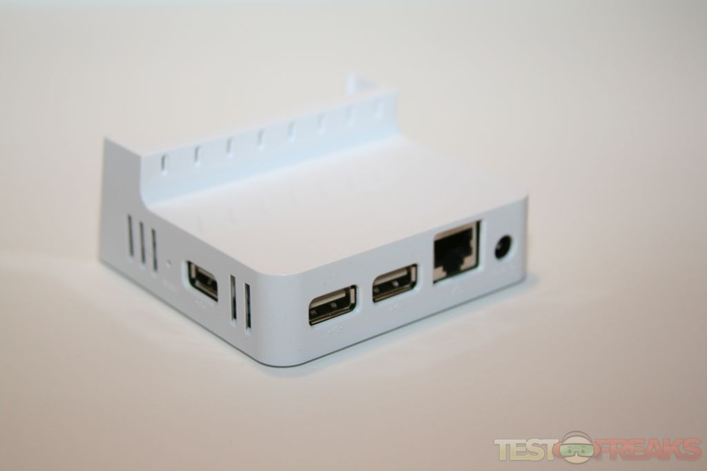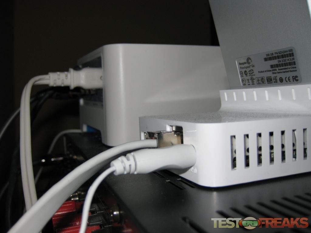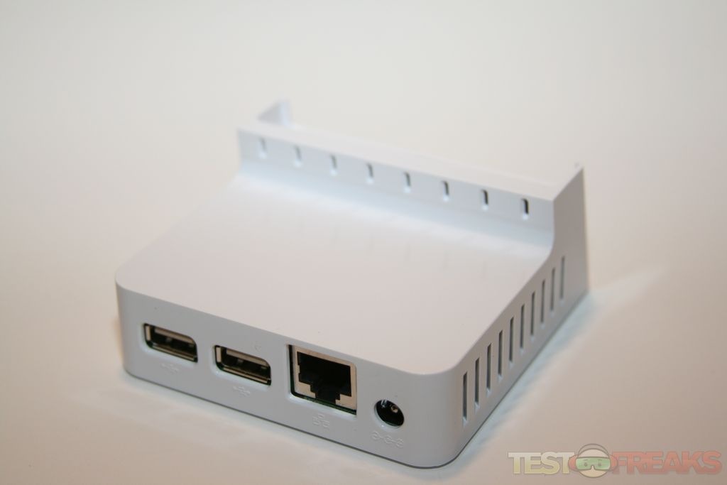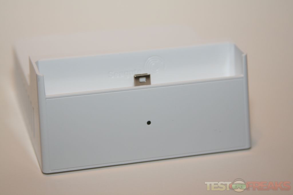 In the front is a central area for docking a FreeAgent Go drive with an indicator light that sits below this area. On the back there are two USB ports, an AC connector and an Ethernet port. On one side we see an additional USB port and the reset button. You’ll also notice around the periphery of the device are numerous slot vent openings to provide cooling.